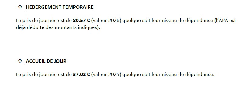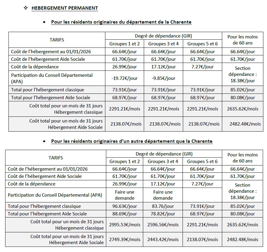 Le tarif journalier est constitué d’un prix de journée Hébergement et d’un forfait Dépendance, variable selon le degré de dépendance du résident.